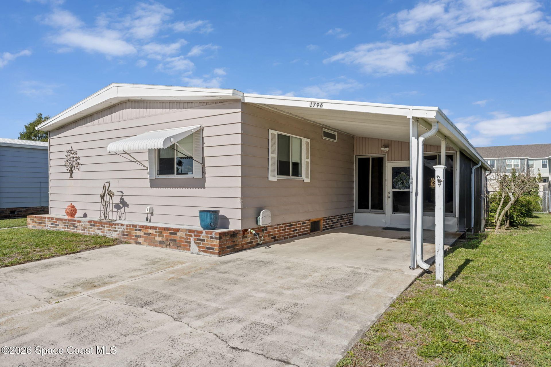 Welcome to Brevard County! Here in NE Palm Bay, close to West Melbourne, youll find a charming 3-bedroom manufactured home in Palm Bay Colony. Best part? You own the lot!! This one comes with a split floor plan and ample storage. Features 2 full baths, a kitchen with electric appliances, linoleum flooring in the kitchen, and carpeted bedrooms--all in great shape. Well maintained with roof (2023), AC (2016), and water heater (2022). Interior laundry room. Carpeted, air-conditioned patio (not in square footage) plus storage. There is a house water treatment system! Quiet canal-front yard. Voluntary $45/month HOA with pool, tennis, pickleball, clubhouse, and events. Close to shopping, I-95, and beaches. Built in 1980--financing possible!